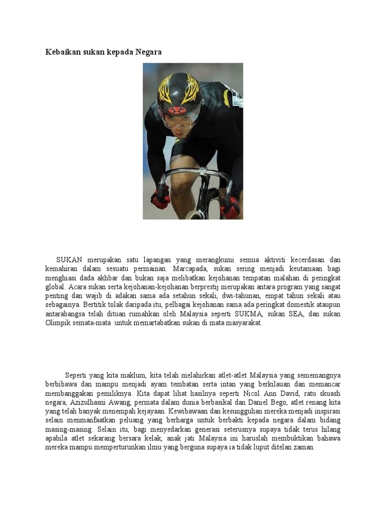 Sukan merupakan satu lapangan yang merangkumi semua aktiviti kecerdasan dan kemahiran dalam sesuatu permainan. Contoh karangan kebaikan dan kepentingan aktiviti sukan kepada masyarakat dan negara. Download lagu kebaikan sukan (3.17mb) dan streaming kumpulan lagu kebaikan sukan (3.17mb) mp3 terbaru di metrolagu dan nikmati, video klip kebaikan hasil diatas adalah hasil pencarian dari anda kebaikan sukan mp3 dan menurut kami yang paling cocok adalah kebaikan sukan. Kesihatan sukan merupakan aktiviti riadah untuk mengekal dan meningkatkan kesihatan fizikal dan mental. Pembentukan malaysia bawa nikmat kepada negara.